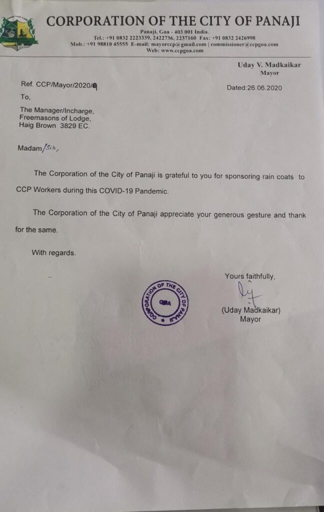 Lodge Haig Brown No. 3829, Goa donated 100 raincoats each to the Goa Police and Panaji Municipal Corporation. Brethren from the Lodge were also actively involved with distribution of food to the under privileged and migrant workers throughout the duration when the city was under complete lock down.